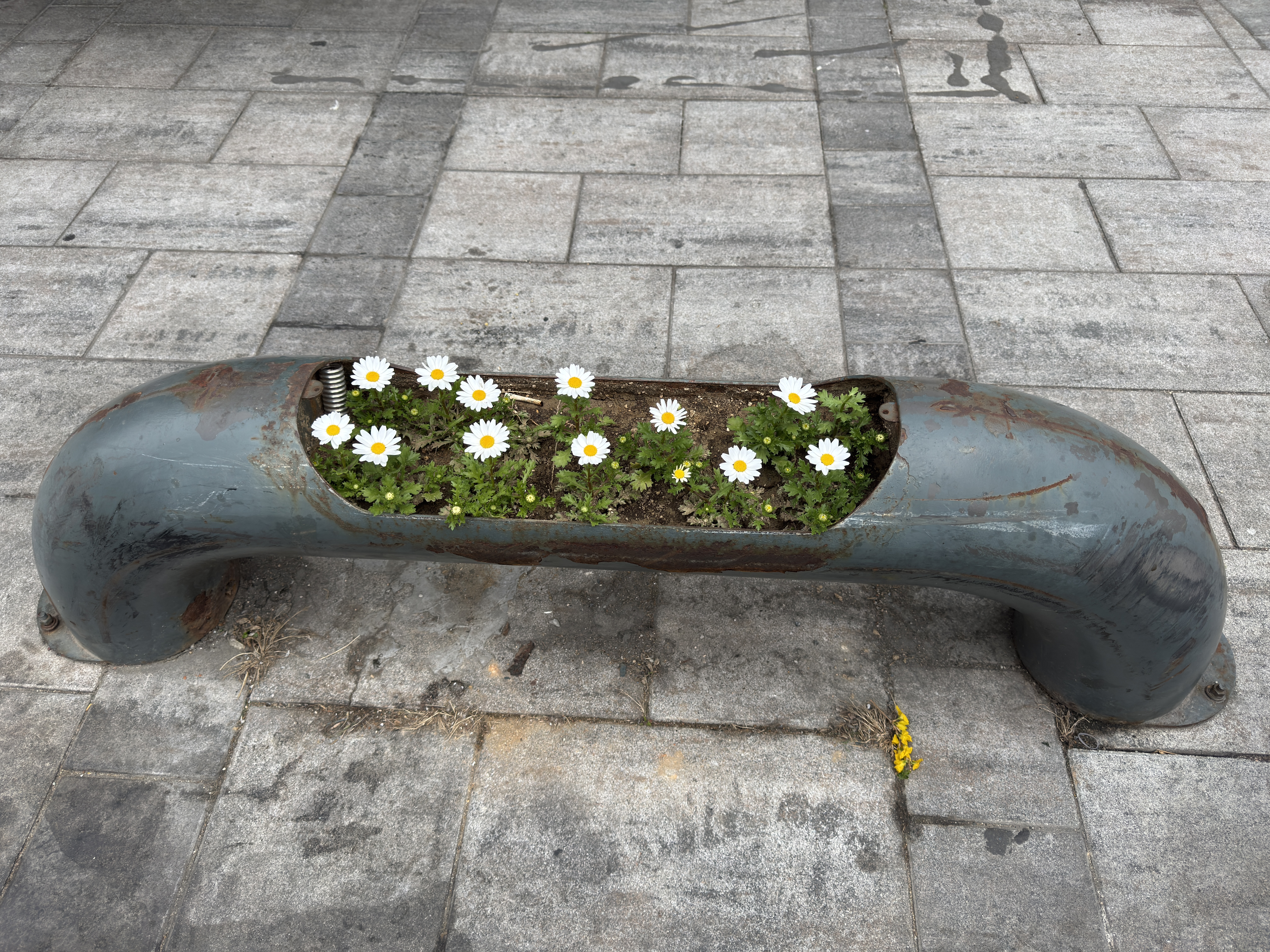 인도와 차도를 구분하기 위해 만들어 놓은 듯한 파이프. 안에 꽃을 심어놓았더니 엄청 이뻤다.